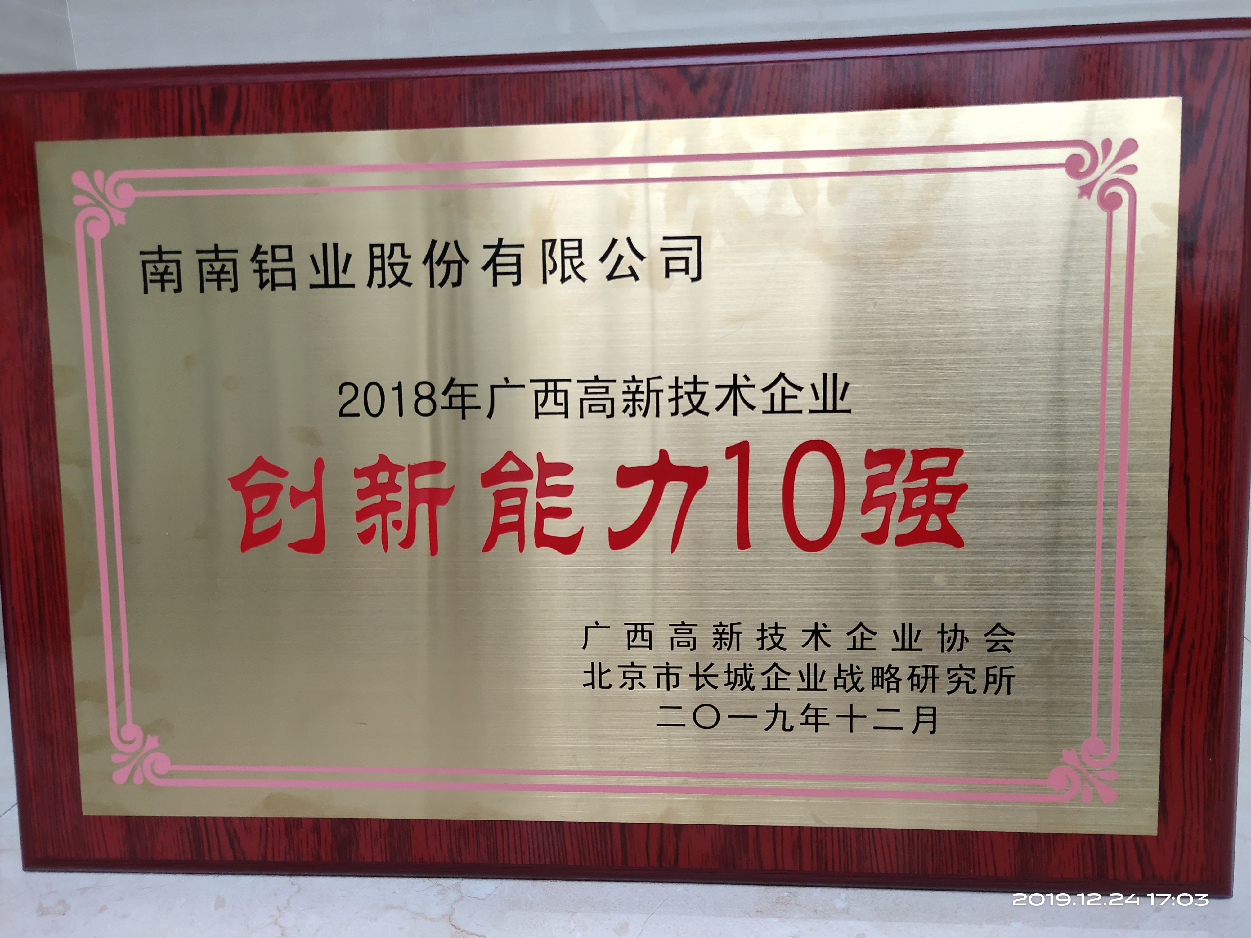 南南铝集团凭借科技创新投入高、科研人才队伍大、研发实力强、领先创新能力的高新技术、科技创新产出指标表现优秀,营收规模大,创新产品销售收入占比高以及拥有专利和科技奖项多等综合实力,在众多参选企业中脱颖而出,荣获广西高新技术企业百强、创新能力十强两项荣誉奖,此次获奖,为南南铝在未来加大规模、突显技术工艺、突出科技创新技能等综合方面挖掘发展潜力奠定了厚实基础。